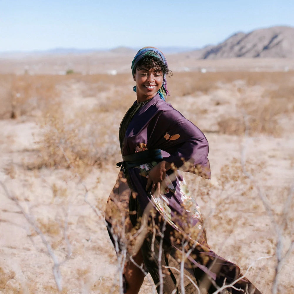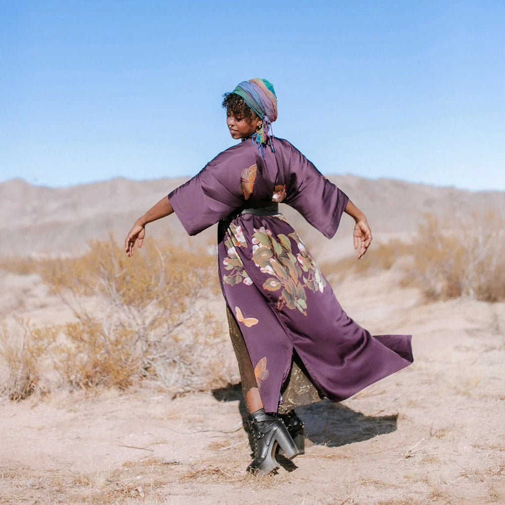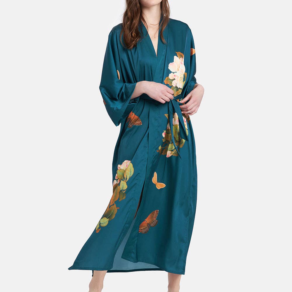 The KIM+ONO Peony & Butterfly Women's Long Kimono Robe combines timeless artistry with effortless elegance. Flowing to the ankle in silky polyester charmeuse, this robe features clusters of pink peonies with green leaves, creating a lush backdrop for delicate butterflies in warm brown tones. The clustered florals leave areas of open space, giving the butterflies room to “fly” across the fabric and adding movement to the design. With its luxurious drape and thoughtful details, this robe feels as graceful as it looks.