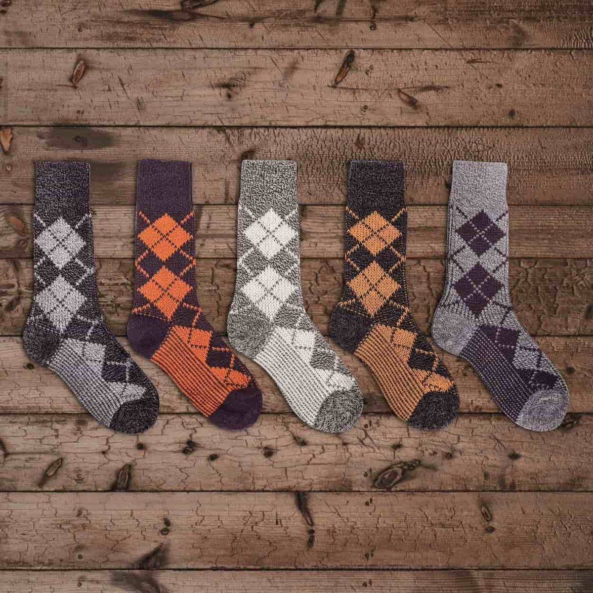 The Vagn Argyle Merino Wool Blend Unisex Socks are offered in a 5-Pair Multi-Pack, bringing classic patterning and everyday comfort together in one versatile bundle. Knitted in Ukraine from a thoughtful blend of acrylic, polyamide, merino wool, and elastane, each pair provides buttery softness, durability, and natural warmth. The Vagn style showcases a timeless argyle knit with contrasting tones, making it a polished choice for both casual and dressed-up wear. This pack includes five distinct colorways — Charcoal & Gray, Haze & Burnt Orange, Ash & Light Gray, Charcoal & Camel, and Gray & Black.